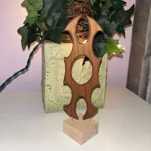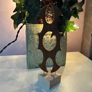 Decorative carved wooden tabletop sculpture. Smooth warm brown wood grain. Mid-century modern inspired silhouette. Ready to display on a shelf or desk. One of a kind handmade by my grandpa!