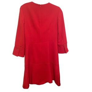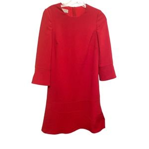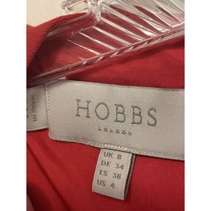 Gently pre-owned Hobbs London Natalia dress in Sienna Red. Classic and elegant solid bright red dress in a flattering silhouette and fit. Round neck, long sleeves that are slightly shortened, slightly flared button cuffs. Flounced hem, concealed back zip with hook-and-eye closure. A-line silhouette, subtle flutter to skirt, lined. Polyester, viscose, spandex material that drapes beautifully. Holiday, Christmas, Valentine's Day, wedding, graduation, work, office, business, career, event, cocktail, party, formal, date, preppy, luxury styles. In great used condition, very minor pull on 1 back seam, see photo.