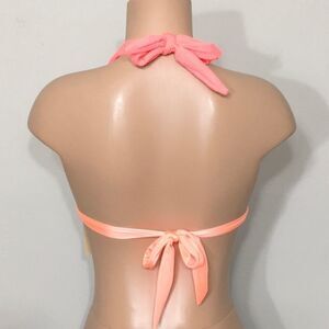 HOBIE neon orange splash string bikini triangle top. I can’t capture the beautiful bright orange in my photos but the triangle is a textured neon orange and the tie is a sherbert orange silky fabric. It’s a great summer color!
