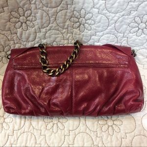 HOBO fuchsia leather bag,brass chain strap, bow design on front, snap closure, inside 8 slip pockets one zip pocket. Like New vintage HOBO bag, gently used