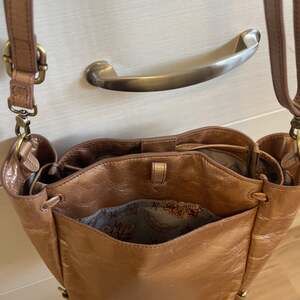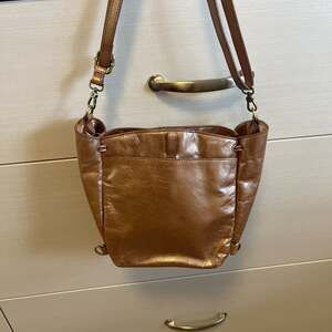 This stunning HOBO rose gold metallic leather crossbody bag is a stylish and versatile accessory. Featuring a main compartment with drawstring closure and tassel detail, an adjustable strap, and an interior pocket for essentials. The shimmery rose gold tone adds a touch of glamour to any outfit. Excellent pre-owned condition with minimal signs of wear; no major flaws. Perfect for day-to-night transitions, this bag combines practicality with high fashion.