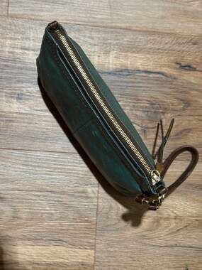 Hobo Sable Leather Wristlet in a deep forest green. This compact clutch is crafted from high-quality, tumbled leather with a vintage-inspired aesthetic. It features a convenient top zip closure with long leather pull tabs and a sturdy wristlet strap for hands-free carry. The interior is spacious enough for your phone, keys, and cards, making it perfect for errands or a night out. Shows some light scuffs and natural character consistent with pre-owned leather gear. Overall very good ready-to-wear condition.