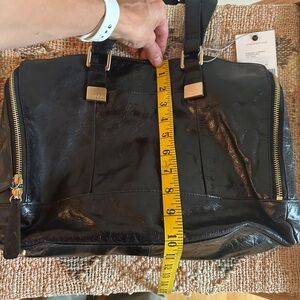Elegant black leather bag. Features gold accents. Perfect for any occasion. Hobo Madelyn bag in patent leather. This is a very classy bag that will take you into the fall and beyond.