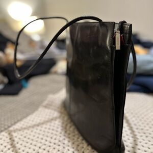 Sleek black leather exterior. Soft pink interior with multiple pockets. Stylish and functional.