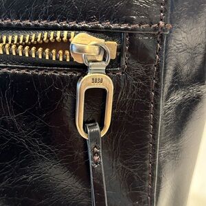 Elegant black leather crossbody / tote bag. Features dual handles and detachable strap. Front zip pocket for easy access.