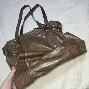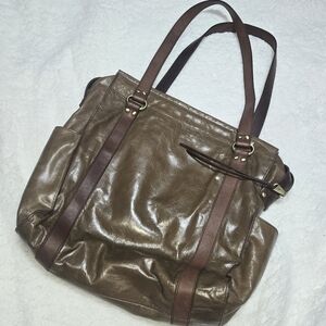 Stylish greenish brown leather tote. Features dual handles. Perfect for everyday use.