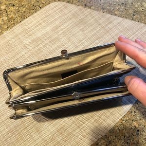 Gorgeous clutch in blue gray metallic. Plenty of compartments for ID and credit cards, keys and a few cosmetic essentials. In excellent condition but for a few lipstick marks as shown in pics.