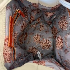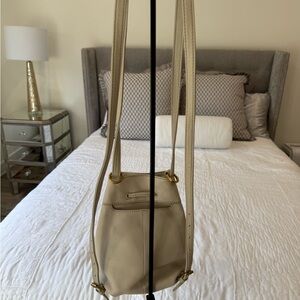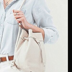 This gorgeous Ramble HOBO convertible can be worn as a backpack & a shoulder bag. It features HOBO's iconic & now discontinued Wanderlust lining, Antique Brass hardware, & their signature Pebbled buttery soft leather. Official color is Dew, an ivory. It has a double pull-string; loosen it down to open, move it up to cinch the top. Inside is a wall zipper pocket, 2 medium pouches, & 1 pen pouch. Also, an outer slip pocket on the back, perfect for your phone. Adjustable buckle straps for comfort. A Rare Find! Appx 8.5"x10"x6.5" expandable.