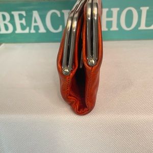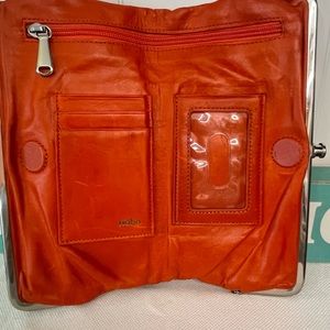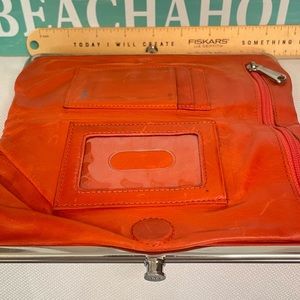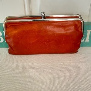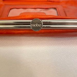 ⚜️⚜️This Buttery soft Hobo double wallet has so much more life left! Has 2 clutch openings one is open with a zipper pocket & the other side has 6 card slots with two bigger pockets. When completely opened there's a zipper pocket that unzips to a large open area. Use as a wallet or a clutch. Pretty orange color. Does have marks on but, I didn't clean it with leather cleaner. In good condition!! 📍PLEASE LOOK AT ALL PICTURES BEFORE PURCHASING📍