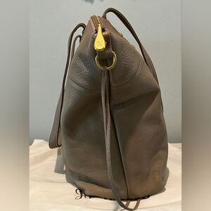 Elegant brown leather tote. Features gold stud accents. Spacious interior. Perfect for everyday use.