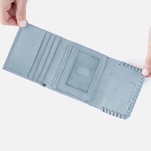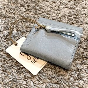 HOBO Foray Small Wallet. Color is Sky. Whipstitch detail. Hidden magnetic closure. Buffed leather. Soft. Timeless. Brushed gold hardware. Sandlewood lining. Interior bill slot, 5 card slots & ID window. Exterior zip pocket. Measures 4”W x 3.5”H x 0.5”D.