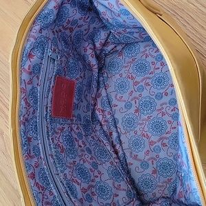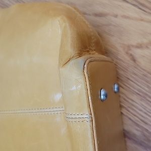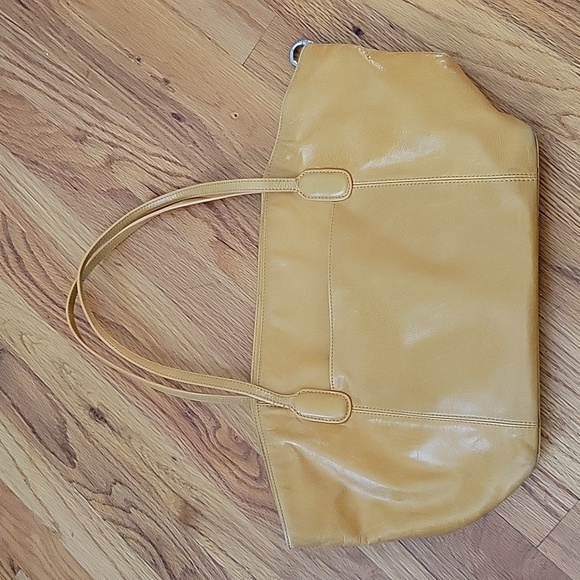 Yellow leather HOBO handbag. Approx 9" straps. Some wear at bottom corners (see pics). Floral print inside. Inside is clean. Includes "I love HOBO" charm at zipper. 2 outside pockets.