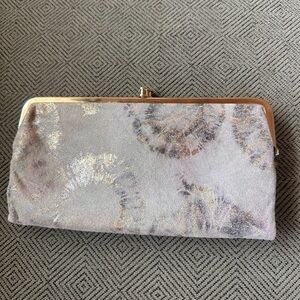 New Care Card HOBO INTERNATIONAL - LAUREN Clutch / Wallet in Metallic Starburst, vintage tumbled leather- feels like suede Clutch folds in half and remains shut with a magnetic closure. When unfolded, you find a zippered pocket, 3 card slots and an ID holder Two main compartments.