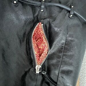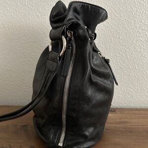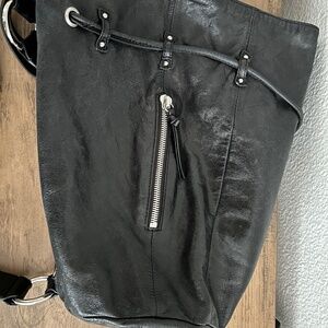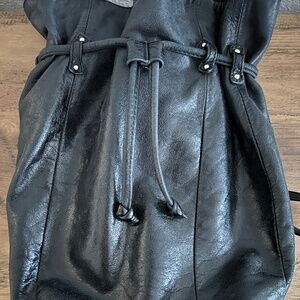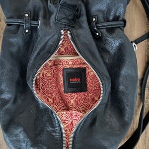 Black HOBO Int'l backpack is made with HOBO's signature buttery leather. Cinch pull tie to open & close. Inside is a zipper pocket & a slip pocket. A long zipper allows you easy access to the inside without having to open then close the pull tie. Small zipper pouch on the outside.