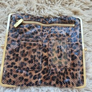 Chic clutch with a bold leopard pattern. Features a sleek frame and secure closure. Ideal for a stylish statement.
