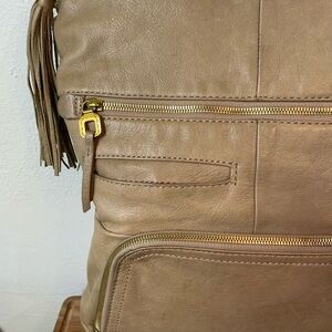 HOBO Leather Shoulder Bag Boho Slouchy Zip Top Pockets Fringe Neutral Classic