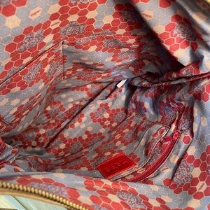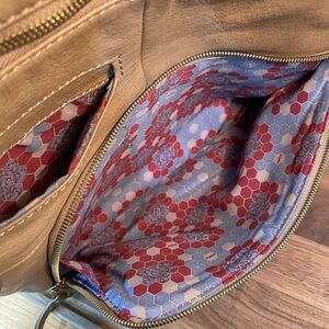 This HOBO leather shoulder bag features a soft, slouchy silhouette in a versatile tan/camel color. Made with genuine leather, it includes a beautifully patterned fabric-lined interior, multiple zipper pockets, and a comfortable shoulder strap. Gold tone Hardwear Great for everyday use or travel Organizer Pre-owned bag Leather has marks Gentle Wear Overall Good Condition See All Photos Approximate Measurements