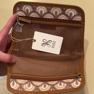 Stylish clutch with a unique multicolor pattern. Features brown trim. Perfect for any occasion.