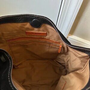 Mixed textures and decorative whipstitching distinguish a spacious shoulder bag fitted with multiple straps for styling versatility.