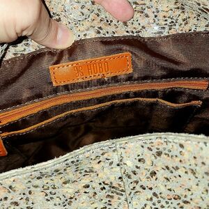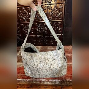 Hobo brand "Render" shoulder bag in Terrazzo Speckled leather. Genuine leather, antique brass hardware, and dark brown interior that is clean. Has the inner lanyard strap with clip for keeping a wallet or clip-on secure. This bag has magnetic closure that is strong and secure. It boasts lots of pockets, two on exterior opposing sides (one has magnetic closure); interior has one zippered pocket and three slip pockets, and one pen pocket.
