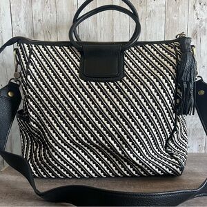 Like new condition! This bag is beautiful with the black and white woven pattern and black leather accents. Wear as a shoulder bag or by hand.