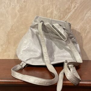 Chic silver light gray backpack with drawstring closure. Sleek and versatile design. Ideal for everyday use. It is by Hobo. The measurements are: 10 inches tall, approximately 11 inches wide and 4 inches deep. The inside has one zippered compartment and three pocket compartments. The inside is in good condition.