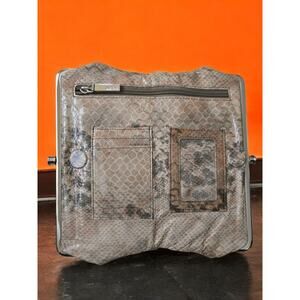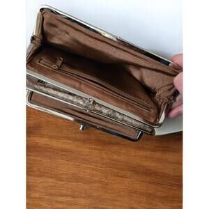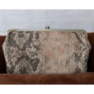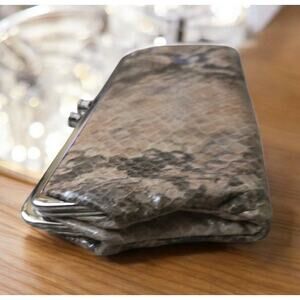 Stylish snake print clutch. Features a sleek metal frame. Perfect for evening outings.