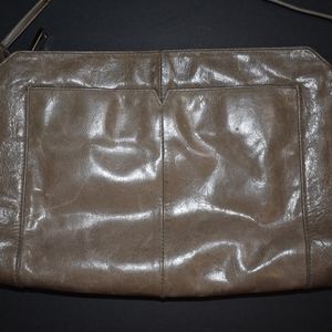 "Stone" color--between tan and grey--distressed / vintage hide leather purse / shoulder bag / crossbody with detachable strap (can also be a large clutch), zip close top, magnetic close front and back pockets, internal zip and slip compartments.