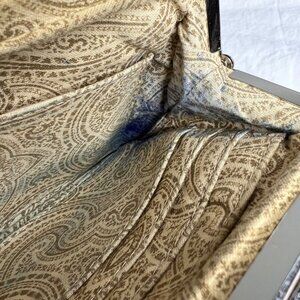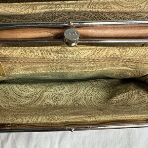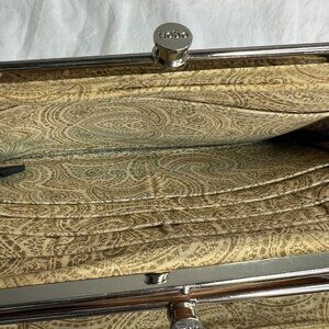 Elegant tan clutch with intricate stitching. Secure clasp closure. Perfect for any occasion.