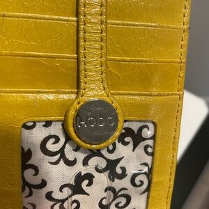 Stylish yellow leather wallet. Features card slots and ID window. Elegant design with black and white pattern.