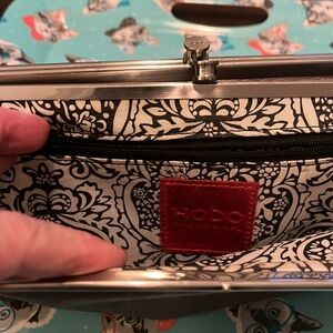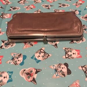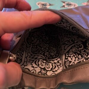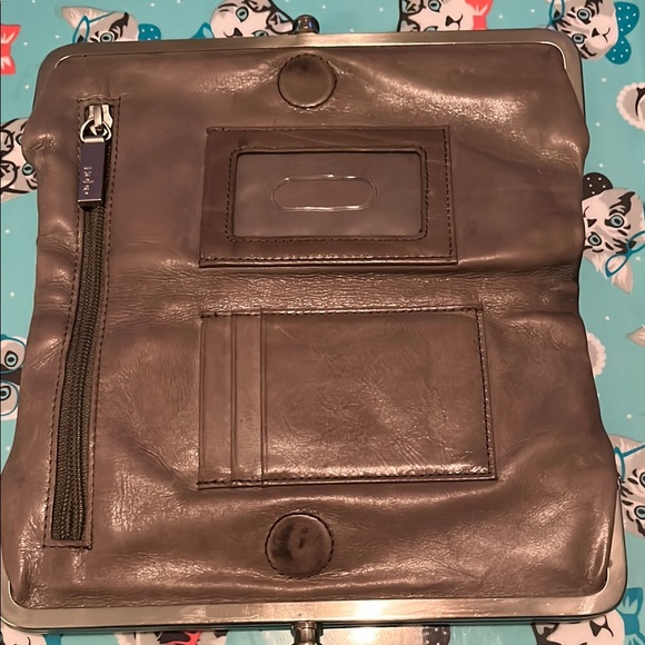 Hobo wallet grey in color with black and white fabric lining is in good used condition and still has lots of life left. Please contact me with questions.