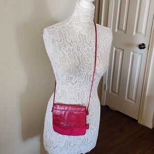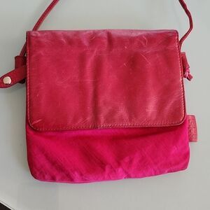 I apologize about the lighting. The true color is a fuchsia. Darling little bag, but it has signs of wear. It is leather and canvas combo. There are some scuffs on the leather flap, and the canvas has some dirt marks, hence the price. Bags 6.6221