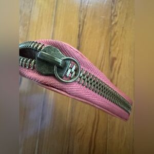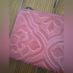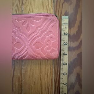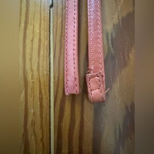 Used once or twice. Embossed. Coral in color. The strap has come off. Easy to repair.
