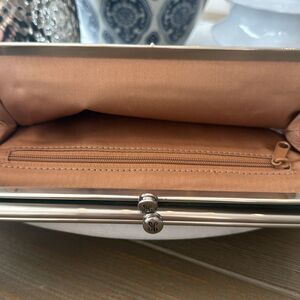 This HOBO clutch features soft, textured leather in a two-sided design. It has a snap closure on both frames and a single magnetic closure at the center. The interior features nine card slots, an ID window and floral lining. This is a handheld wallet.