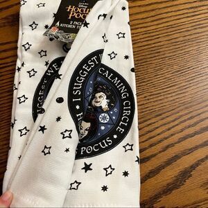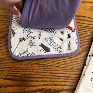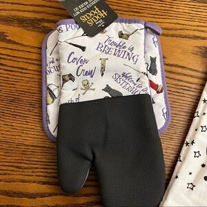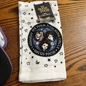 Hocus Pocus Pot Holder Set/Oven Mitt Set & kitchen towel set. Features all 3 sisters. Towel reads “I suggest we form a calming circle.” Brand new with tags. Great for Halloween or anytime! Photos are a part of the description. Color may vary with lighting or device.