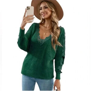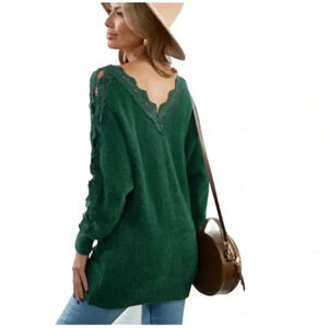 HODAMODA | Women Green Lace Splicing V Neck Pullover Sweater Size M