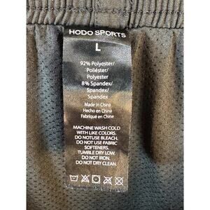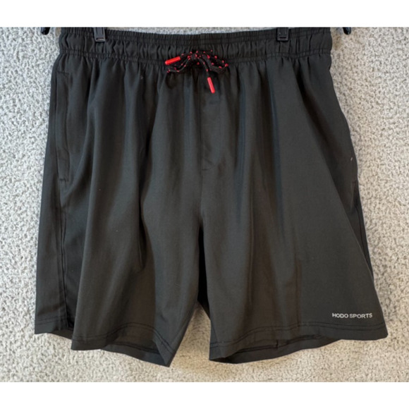 HODO Sports mens swim trunks size Large in black with stretch fabric and built in mesh liner. Features elastic waistband with drawstring and zippered side pockets, suitable for swimming workouts or warm weather wear.