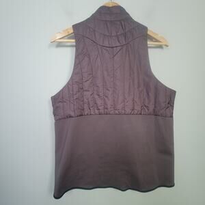 HOKA Coldsnap women’s insulated vest in size M, in a rich brown color. Designed for performance and outdoor activity, this vest features a full zip front, zippered side pockets, drawcord at the neck, and a wind-resistant, lightweight construction — ideal for running, hiking, or layering in cool weather.