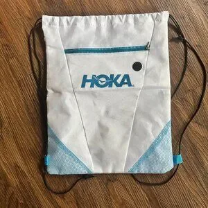 Great condition HOKA drawstring bag with front zipper pocket and headphone passthrough. White/blue.