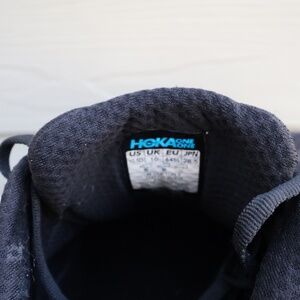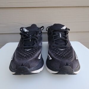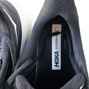 Lightweight and cushioned HOKA Clifton 9 running shoes in men’s size 10.5. Features HOKA’s signature soft, responsive midsole for everyday training and walking. Black/gray upper with white midsole.