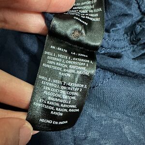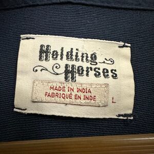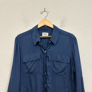 This Holding Horses Anthropologie tunic shirt is perfect for any casual or travel occasion. The shirt features a solid blue color with a collared neckline and button closure. The long roll tab sleeves add a touch of bohemian style to the shirt, making it perfect for a beach or casual outing. Made with a lightweight and sheer material, this shirt is ideal for all seasons and can be easily machine washed. The relaxed fit and size L make it comfortable and easy to wear for any woman. This shirt is a must-have for anyone looking for a classic and stylish addition to their wardrobe.