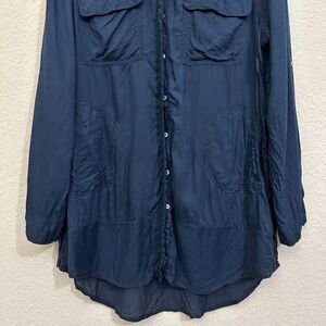 HOLDING HORSES ANTHROPOLOGIE Tunic Shirt Womens Sz L Navy Blue Roll Tab Sleeve W10265