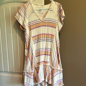 Chic dress with multicolor stripes. Features short sleeves and a V-neck. Perfect for casual outings.