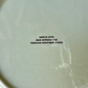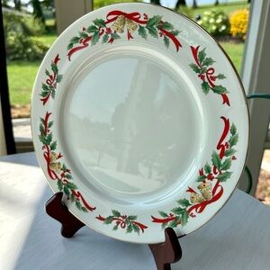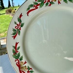 HOLIDAY DINNER PLATE, CRAFTED IN JAPAN. RED BOWS & RIBBON WITH BELLS & HOLLY ON AN OFF- WHITE BACKGROUND. GOLD TRIM ACCENTUATES THE RIM. MADE EXPRESSLY FOR FEDERATED STORES. 10 1/2”ROUND PLATE.