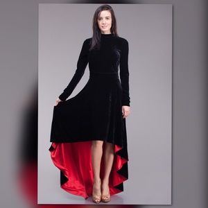 ⭐️⭐️⭐️⭐️⭐️ 5 Star Rating Beautiful Black Velvety Soft Dress Contrasting Red Satiny Lining Long Sleeve High Neck Asymmetric Hem and Cut-out Back.