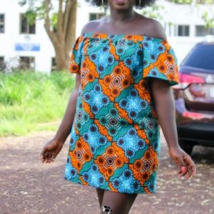 This stylish and flirty Blue Off-The-Shoulder Dress is made with beautiful African Ankara print material.