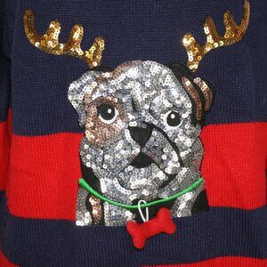 HOLIDAY TIME Sweater Bulldog Moose Knit Christmas Ugly Sequin Antler Stripe Red