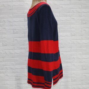 Round crewneck almost boat neckline with red ribbed striped bands on neckline and sleeves