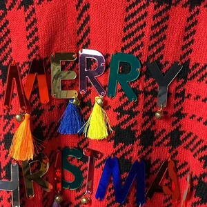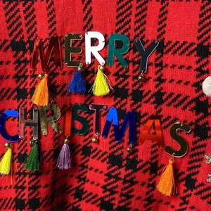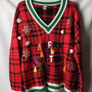 HOLIDAY TIME WO SIZE LARGE 12/14 CHRISTMAS SWEATER MISSING TASSELS CAN BE ADDED MERRY CHRISTMAS IN METALLIC LETTERS AND BELLS RED BLACK PLAID GOOD CLEAN CONDITION LENGTH MEASURES APPROX 28” FROM SHOULDER TO HEM SLEEVES MEASURE APPROX 28” CHEST MEASURES APPROX 23” FROM SIDE TO SIDE SOFT