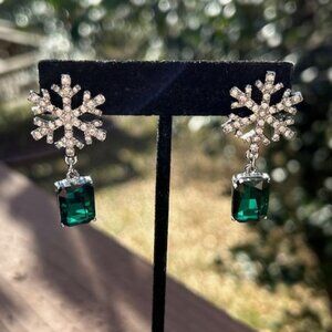 • Fun Betsey Johnson Christmas Holiday Snowflake Green Crystal Silver-Tone Drop Earrings